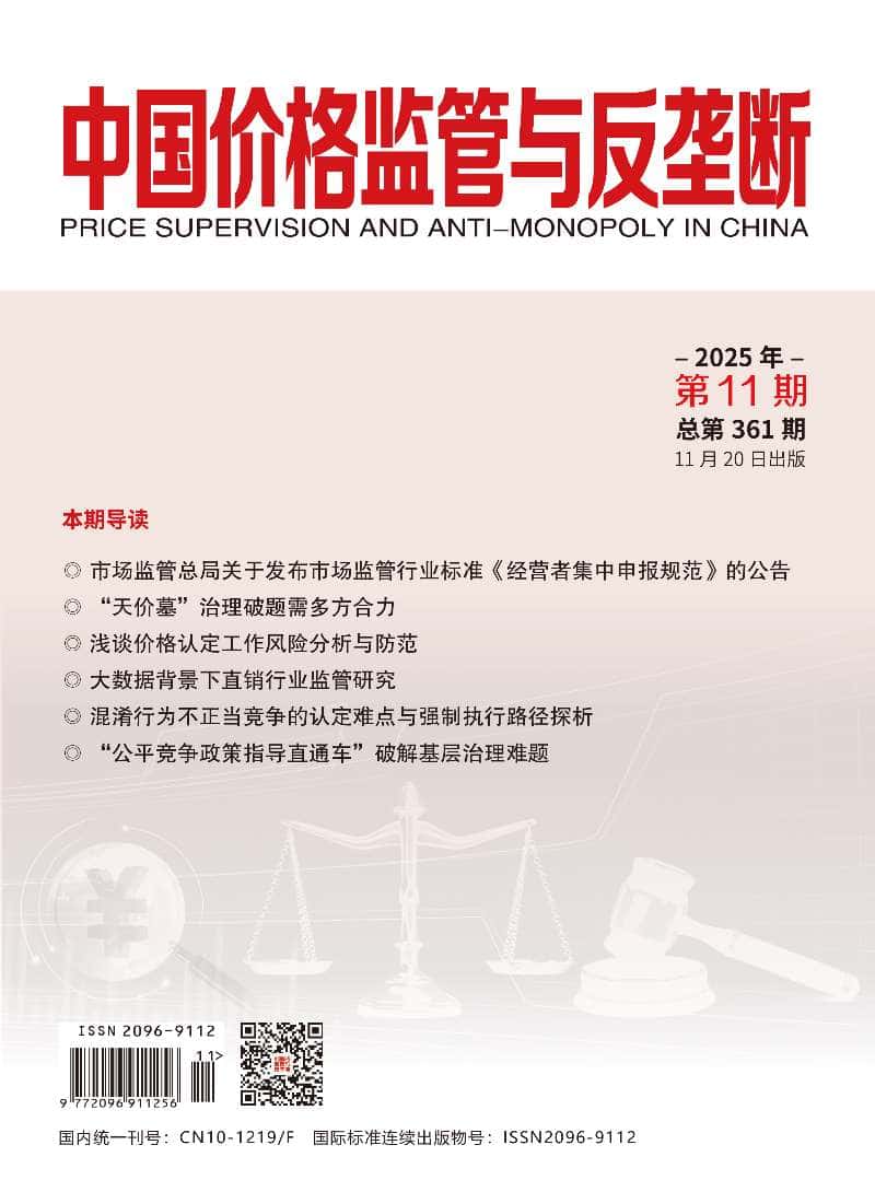 《中国价格监管与反垄断》杂志(国内统一刊号:CN10-1219/F;国际标准连续出版物号:ISSN2096-9112),是由国家发展和改革委员会、国家市场监督管理总局政策业务指导,中国价格协会主管、主办,全国发行的专门宣传报道价格监督检查、公平竞争审查、反不正当竞争和反垄断行政执法的国家级经济类月刊,既是行政执法的工具书、市场监管的资料库,又是开拓视野的知识窗,在价监竞争、反垄断条线具有很强的权威性、指导性、可操作性和较大影响力。通过本刊,各地价格监管与反垄断机构,以及执法人员能在第一时间分享国家有关部委最新政策信息、最新工作动态、价监竞争与反垄断执法经验体会文章、专家学者最新研究成果。本刊已经成为广大价格行政执法工作者交流工作成果、探讨执法难点、了解相关法律法规政策的重要窗口;反垄断、反不正当竞争等理论研究人员发表创新成果的主要阵地和国家级优选平台。2025年,《中国价格监管与反垄断》将优化栏目、充实版面,提供更多优秀作品馈赠广大读者,继续以创刊30多年的成熟经验为价格监督检查、反不正当竞争和反垄断事业提供服务、奉献智慧。